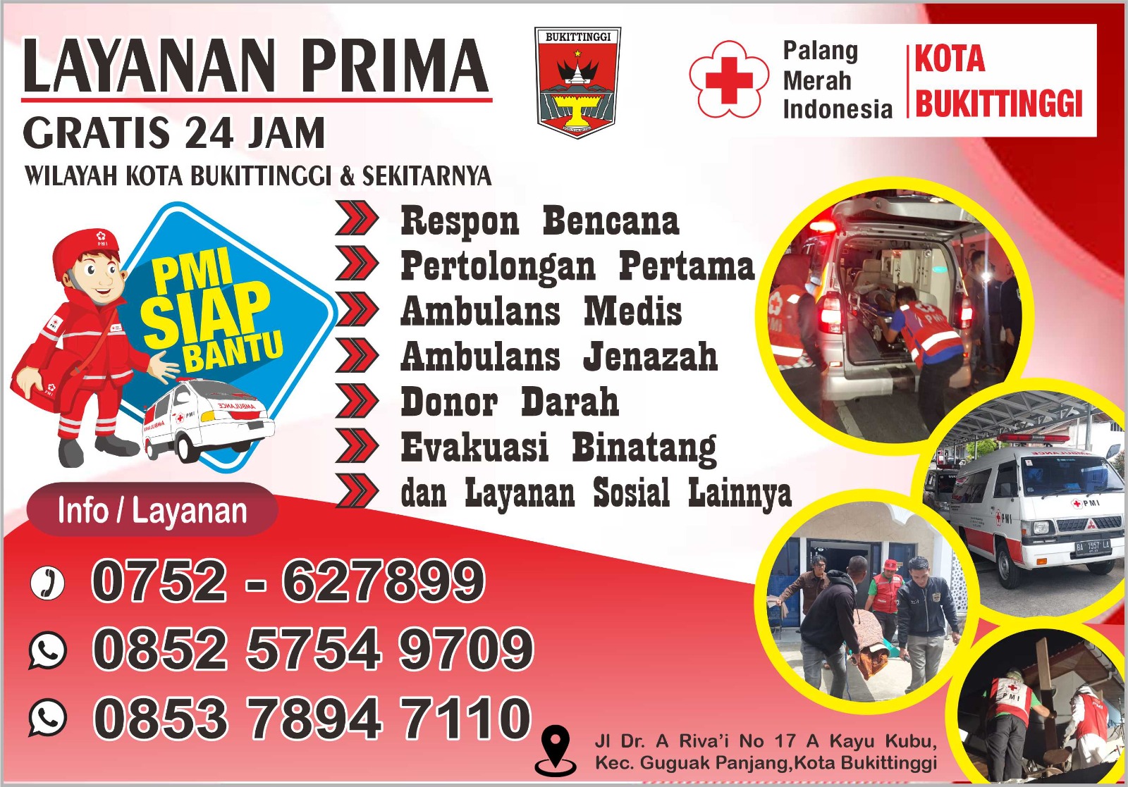 Seluruh layanan ini dapat diakses secara gratis dan 24 jam penuh. Untuk memastikan respon cepat, relawan PMI Bukittinggi selalu siaga setiap hari di markas PMI yang beralamat di Jl. Dr. A Riva’i No. 17A, Kayu Kubu, Kecamatan Guguak Panjang, Kota Bukittinggi.
