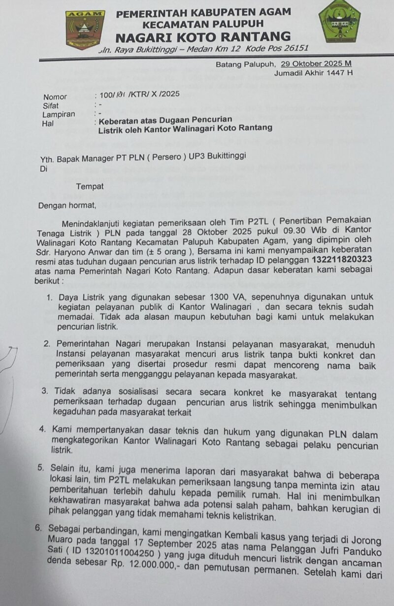 Batang Palupuh, 29 Oktober 2025 — Pemerintah Nagari Koto Rantang menyampaikan keberatan keras kepada PT PLN (Persero) UP3 Bukittinggi atas tuduhan pencurian listrik terhadap Kantor Wali Nagari Koto Rantang (ID Pelanggan 132211820323).