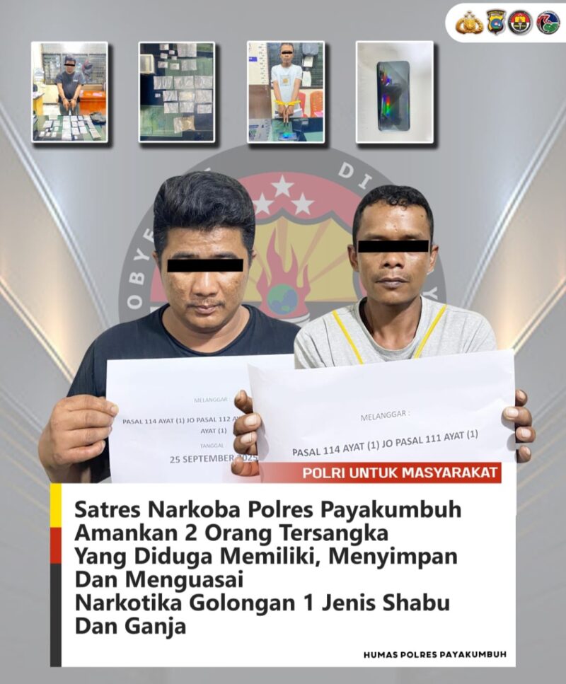 Payakumbuh,- Satuan Narkoba Polres Payakumbuh berhasil menangkap dua orang tersangka pelaku tindak pidana narkotika jenis ganja dan sabu-sabu, Kamis (25/9) di dua tempat yang berbeda.