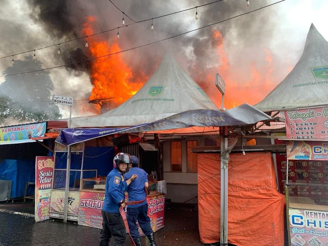 RILIS INFO Emergency FB Dinas Pemadam Kebakaran dan Penyelamatan Kota Bukittinggi, terkait dengan perbantuan operasional pemadaman luar daerah, dilaporkan telah terjadi kebakaran sekira jam 08.25 WIB (Pagi) di Pasar Kuliner, Jl. Mr.Assad RT 04, Kelurahan Balai-Balai, Kecamatan Padang Panjang Barat, Kota Padang Panjang. Jum’at, 27 Oktober 2023.