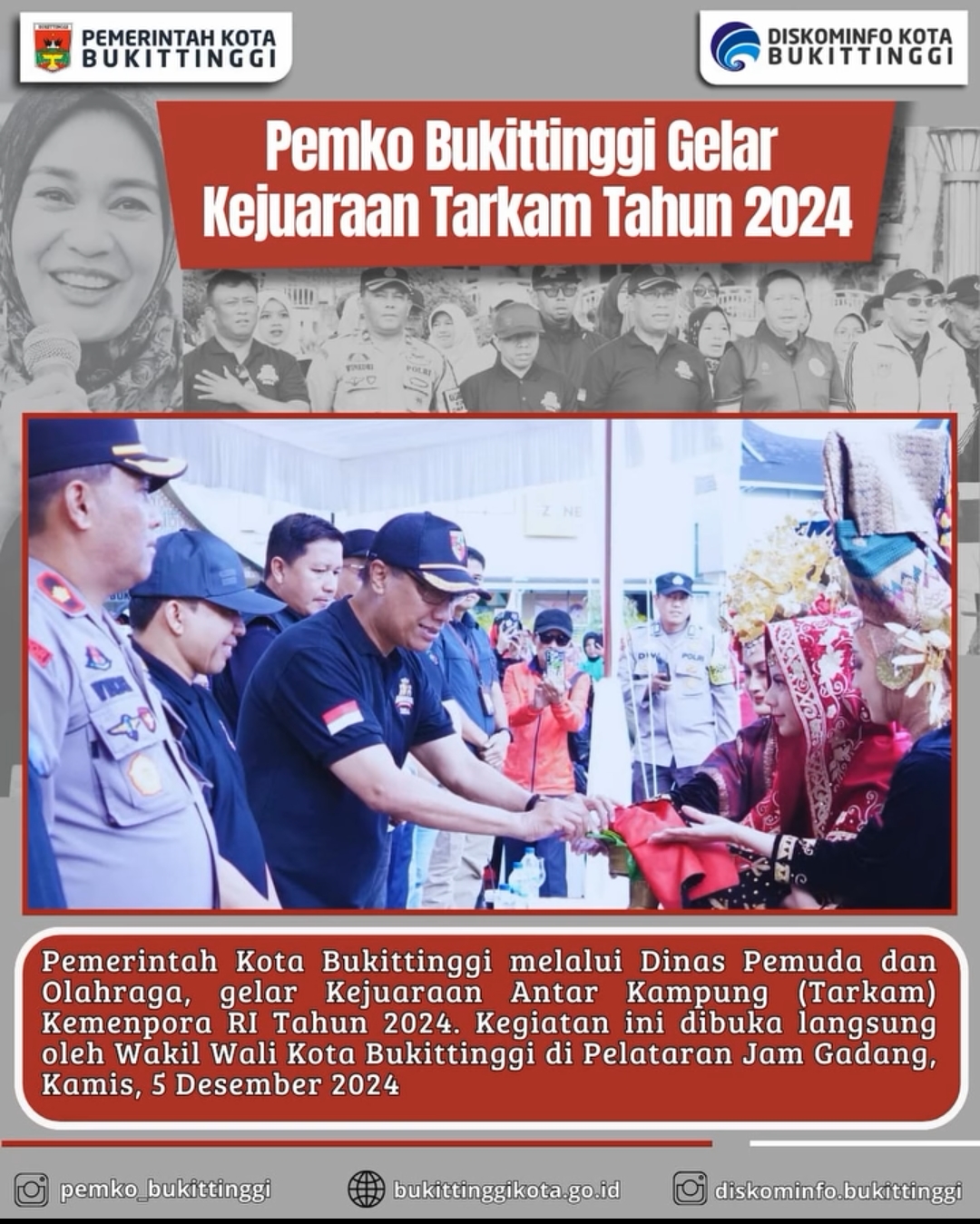 Wakil Wali Kota Bukittinggi, Marfendi, menyampaikan, terima kasih telah mempercayakan Kota Bukittinggi sebagai salah satu tuan rumah penyelenggaraan Kejuaraan Antar Kampung (Tarkam) Tahun 2024. Ini merupakan salah satu event bergengsi Kemenpora dalam mewujudkan generasi muda yang kuat menuju Indonesia Emas Tahun 2025. Bahkan, dengan kegiatan positif seperti ini, dapat menjauhkan masyarakat dari judi online yang jadi salah satu musuh utama Indonesia saat ini.