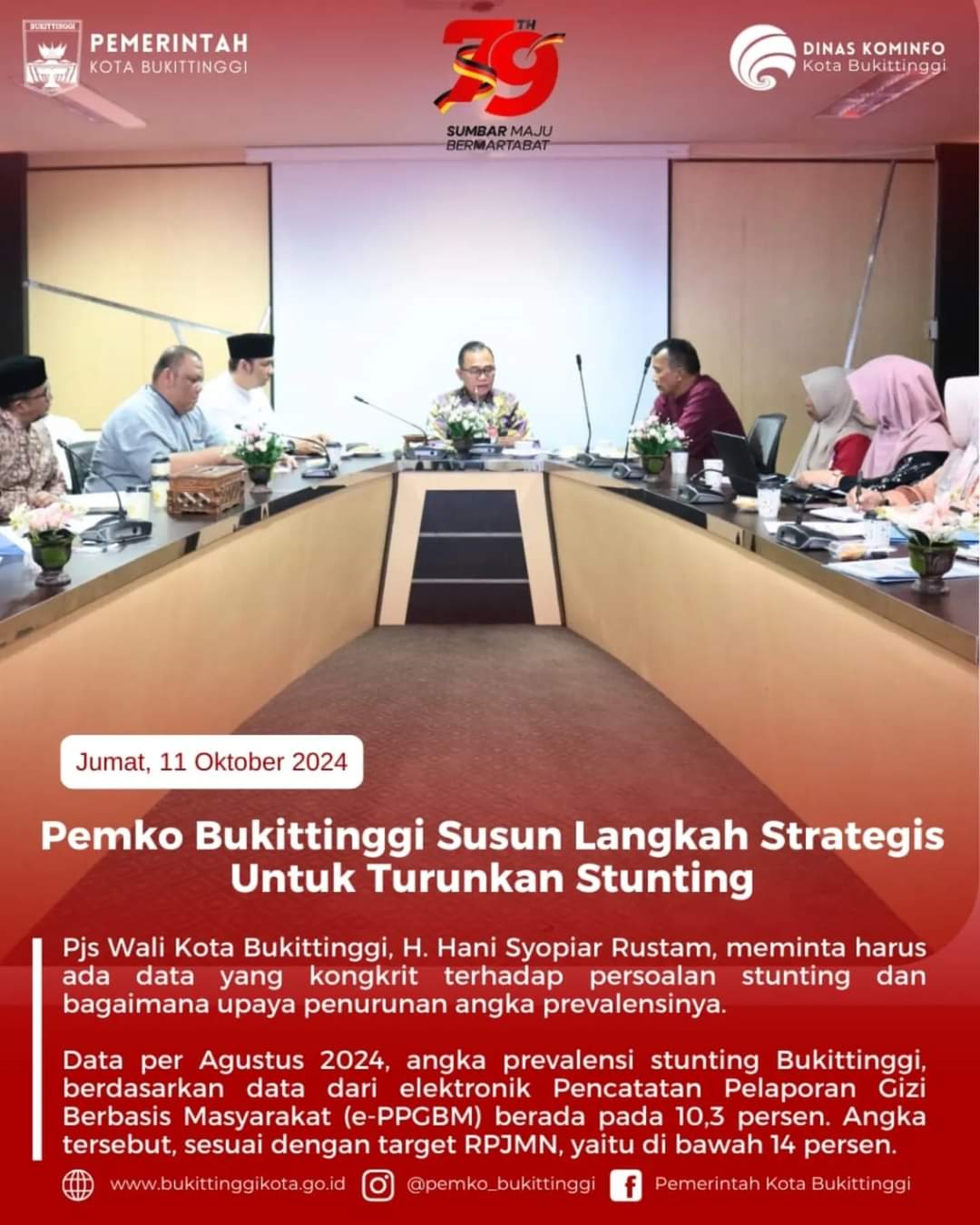 Bukittinggi, terasnagarinews.com. Pemerintah Kota Bukittinggi gelar rapat koordinasi terkait upaya penurunan angka stunting di Bukittinggi. Rapat yang dipimpin Pjs Wali Kota itu dilaksanakan di Bukittinggi Command Center, Jumat, 11 Oktober 2024.