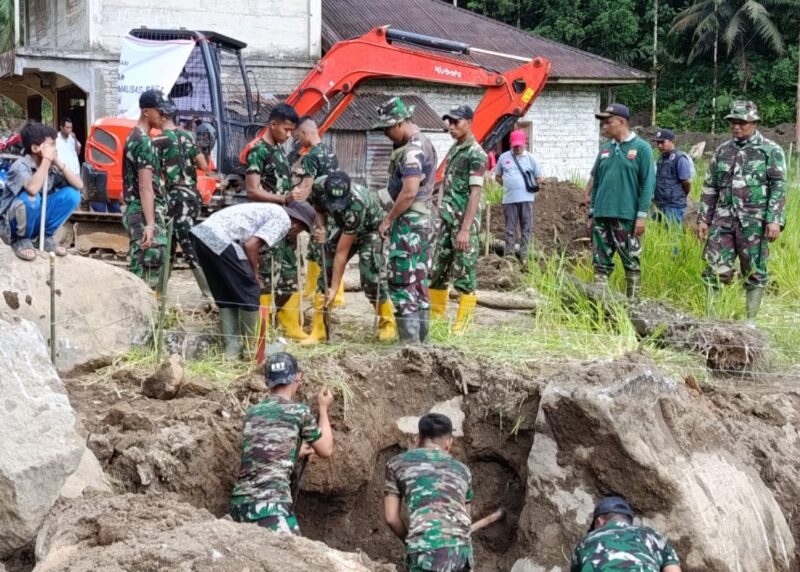 Personel TNI bersama warga terlihat bahu-membahu di lapangan, memastikan setiap tahapan pekerjaan berjalan sesuai rencana dan tetap mengutamakan keselamatan kerja.