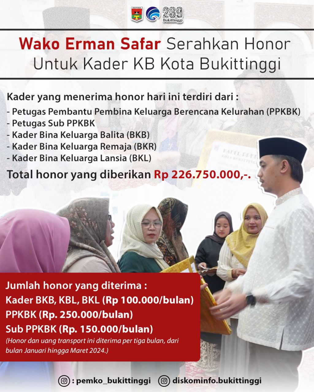 Wako Erman Safar Serahkan Honor Untuk 641 Orang Kader KB Kota Bukittinggi